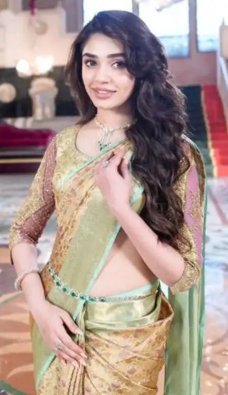 This is the second most costly saree in the Diadem – Ashirah Sil, which costs Rs. 128,250. This saree has a woven floral motif, a matching green zari pallu, a zari border, and an olive green blouse.