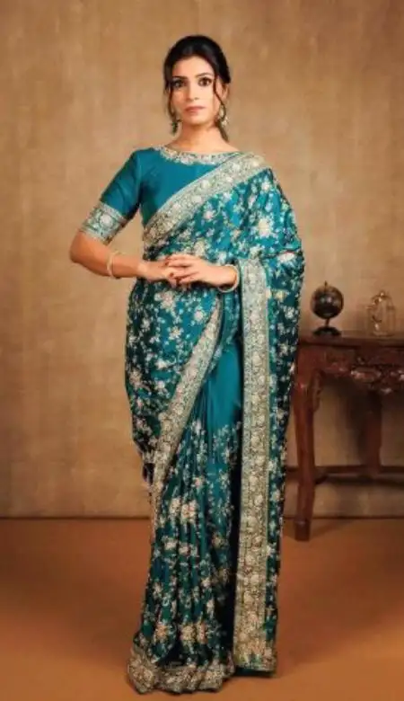 5. Peacock Green Bridal Saree Zardosi Floral Design