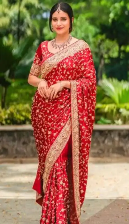 4. Red Floral Embroidered Satin Bridal Designer Saree
