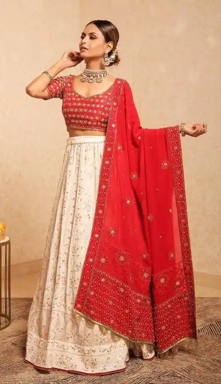 5) White with Red Prints – Diadem – bridal lehe