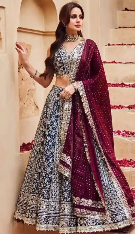 The wine and blue lehenga combination is a gorgeous pick for when you want to exude a regal charm. This duo has gained immense popularity for its ability to suit different occasions, from weddings to festivals. The richness of the wine and the grace of blue together create a pleasant contrast. Choose this color combination for a striking yet subtle look.